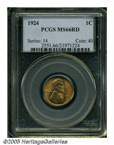 <B>1924<1C> MS66 Red PCGS.</B></I> Sharply struck and fully brilliant with bright orange luster. Frosty and attractive, the reverse color slightly mellowed. An important opportunity as PCGS has only certified three finer examples of this issue. Population: 60 in 66, 3 finer (5/05).