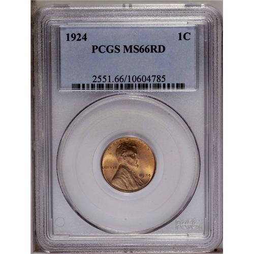 <B>1924<1C> MS66 Red PCGS.</B></I> Rich, frosted red mint luster swirls around both sides of this immaculate, upper-end coin. Heavy metal flow gives the coin a matte appearance beneath the cartwheel mint frost. Essentially unaffected by post-striking abrasions. Population: 59 in 66, 4 finer (3/06). <BR><BR><B>Important notice:</B> Heritage usually auctions material at the rate of 200-250 lots per hour. On some occasions eBay Live bid software or the Internet may not be able to keep up with the pace of the auction. We recommend placing a realistic absentee bid now as insurance to avoid disappointment. Occasionally the auctioneer may eliminate or reject an eBay Live bid, and the auctioneer may also reopen a lot after the close of the eBay live bidding (usually because we missed an audience bid), and may reject your bid even if it shows you as the winning bidder. By bidding via eBay Live, you agree that Heritage may award the lot to another bidder at its sole discretion under the circumstances described above or any other reasonable circumstances. Since eBay bids are not shown to us until we open the lot on the floor, we treat those bids just like floor bids. In most cases the floor responds before the eBay bid is presented to us, due to Internet lag time, so for consistency we have made it a policy that floor bids are always considered first over tie eBay live bids. Also please note that all Heritage lots purchased through eBay Live carry a 20% Buyer's Premium. Please make sure you read the Terms and Conditions before you bid. This lot is being auctioned in conjunction with a live floor auction by Heritage Galleries & Auctioneers. All final auction and invoice information will be supplied by Heritage Galleries & Auctioneers, and all other information should be considered preliminary. Lot:644 <BR><BR><B>Winning Notification and Billing:</B> After the FINAL session in this auction is complete, Heritage will send e-mail and snail mail invoices. This process normally takes several days. All final auction and invoice information will be supplied by Heritage Galleries & Auctioneers, and all other information should be considered preliminary. <BR><BR>This auction will be conducted on a live auction floor and over the Internet through eBay Live. If you choose to place an absentee bid, please take a moment to <font color='#0000ff'><u><a href='http://pages.ebay.com/liveauctions/help/before/laabsentee.html'>learn how eBay Live absentee bidding works</a></u></font><font color='#000000'>