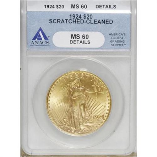 <B>1924 $20 --Cleaned, Scratched--ANACS MS60 Details.</B></I> NGC Census: (690/239011). PCGS Population (2022/206941). Mintage: 4,323,500. Numismedia Wsl. Price for NGC/PCGS coin in MS60: $925. (#9177)<BR><BR><B>Coin Engraver:</B> Augustus Saint-Gaudens<BR><BR><b>Shipping:</b> Coins & Currency (<a target="_blank" href="http://www.heritageauctions.com/common/shipping.php">view shipping information</a>)