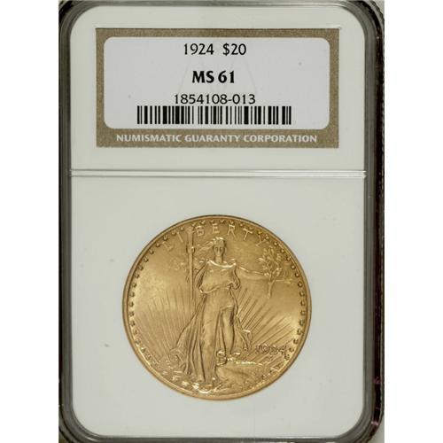 <B>1924 $20 MS61 NGC.</B></I> NGC Census: (5929/225079). PCGS Population (8412/185418). Mintage: 4,323,500. Numismedia Wsl. Price for NGC/PCGS coin in MS61: $715. (#9177)<BR><BR><b>Shipping:</b> Coins & Currency (<a target="_blank" href="http://www.heritageauctions.com/common/shipping.php">view shipping information</a>)