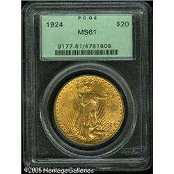 <B>1924 $20 MS61 PCGS.</B></I> An older holder representative with a good strike and no singularly mentionable marks. A faint vertical grease streak (as made) is on the central reverse. Lot:9638