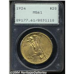 <B>1924<$20> MS61 PCGS.</B></I> Lightly abraded with medium gold color and no singularly mentionable distractions. Housed in a first generation PCGS slab. <BR><BR><B>Important notice:</B> Heritage usually auctions material at the rate of 200-250 lots per hour. On some occasions eBay Live bid software or the Internet may not be able to keep up with the pace of the auction. We recommend placing a realistic absentee bid now as insurance to avoid disappointment. Occasionally the auctioneer may eliminate or reject an eBay Live bid, and the auctioneer may also reopen a lot after the close of the eBay live bidding (usually because we missed an audience bid), and may reject your bid even if it shows you as the winning bidder. By bidding via eBay Live, you agree that Heritage may award the lot to another bidder at its sole discretion under the circumstances described above or any other reasonable circumstances. Since eBay bids are not shown to us until we open the lot on the floor, we treat those bids just like floor bids. In most cases the floor responds before the eBay bid is presented to us, due to Internet lag time, so for consistency we have made it a policy that floor bids are always considered first over tie eBay live bids. Also please note that all Heritage lots purchased through eBay Live carry a 20% Buyer's Premium. Please make sure you read the Terms and Conditions before you bid.