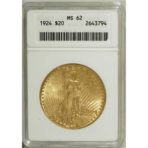 <B>1924 $20 MS62 ANACS.</B></I> NGC Census: (36518/190110). PCGS Population (37420/147977). Mintage: 4,323,500. Numismedia Wsl. Price for NGC/PCGS coin in MS62: $735. (#9177)<BR><BR><B>Coin Engraver:</B> Augustus Saint-Gaudens<BR><BR><b>Shipping:</b> Coins & Currency (<a target="_blank" href="http://www.heritageauctions.com/common/shipping.php">view shipping information</a>\)