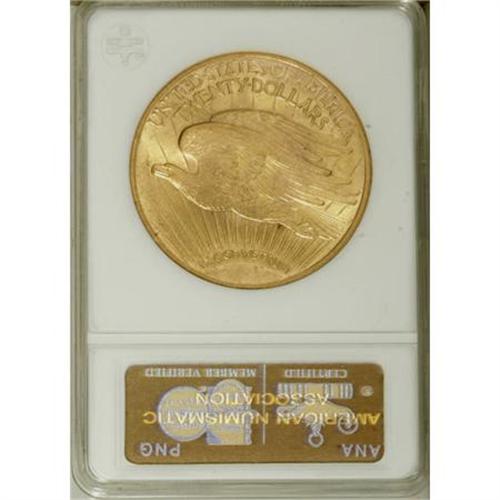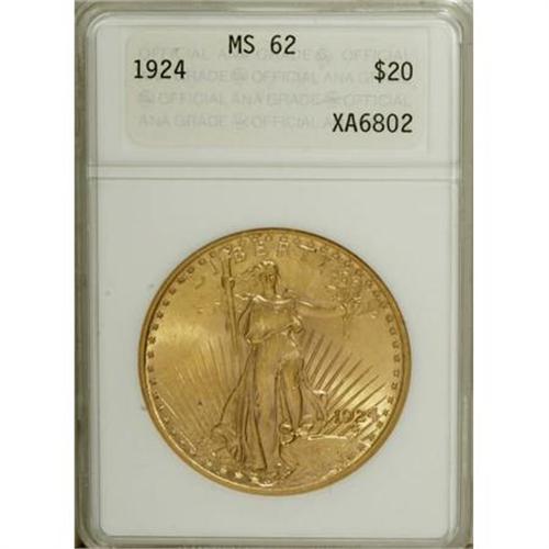 <B>1924 $20 MS62 ANACS.</B></I> NGC Census: (36619/191652). PCGS Population (37509/153638). Mintage: 4,323,500. Numismedia Wsl. Price for NGC/PCGS coin in MS62: $725. (#9177)<BR><BR><B>Coin Engraver:</B> Augustus Saint-Gaudens<BR><BR><b>Shipping:</b> Coins & Currency (<a target="_blank" href="http://www.heritageauctions.com/common/shipping.php">view shipping information</a>)