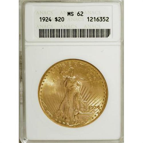 <B>1924 $20 MS62 ANACS.</B></I> NGC Census: (37720/196657). PCGS Population (37942/163430). Mintage: 4,323,500. Numismedia Wsl. Price for NGC/PCGS coin in MS62: $1,040. (#9177)<BR><BR><B>Coin Engraver:</B> Augustus Saint-Gaudens<BR><BR><b>Shipping:</b> Coins & Currency (<a target="_blank" href="http://www.heritageauctions.com/common/shipping.php">view shipping information</a>)