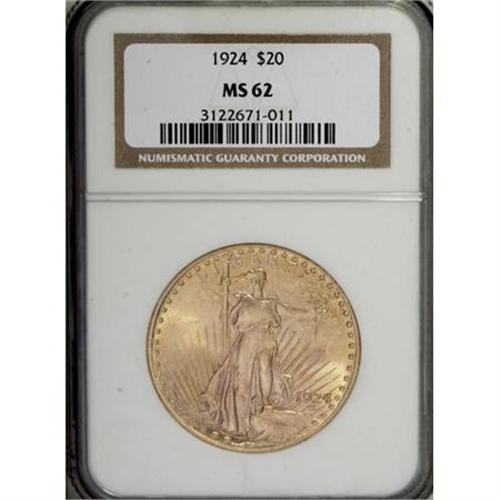 <B>1924 $20 MS62 NGC.</B></I> . NGC Census: (37396/195493). PCGS Population (37821/160704). Mintage: 4,323,500. Numismedia Wsl. Price for NGC/PCGS coin in MS62: $990. (#9177)<BR><BR><B>Coin Engraver:</B> Augustus Saint-Gaudens<BR><BR><b>Shipping:</b> Coins & Currency (<a target="_blank" href="http://www.heritageauctions.com/common/shipping.php">view shipping information</a>)