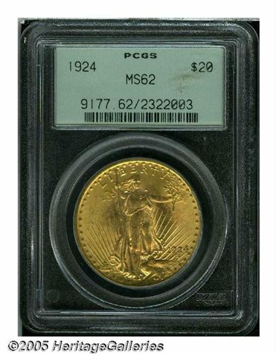 <B>1924<$20> MS62 PCGS.</B></I> A satiny and original golden-brown older holder type coin, the eye appeal is above average for the MS62 grade.