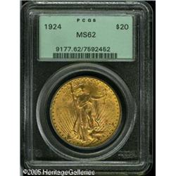 <B>1924 $20 MS62 PCGS.</B></I> Splashes of peach color confirm the originality of this available date Twenty. A contact mark is on Liberty's chest and a soft strike is noted on the Capitol building. Lot:9646