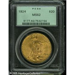 <B>1924 $20 MS62 PCGS.</B></I> The surfaces preservation is typical for the grade with foreign black spots on top of parts of the obverse and reverse. Lot:9650