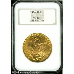 <B>1924 $20 MS63 NGC.</B></I> Splendid yellow-gold luster with deeper honey-gold color. A lovely example with excellent eye appeal. Lot:9672