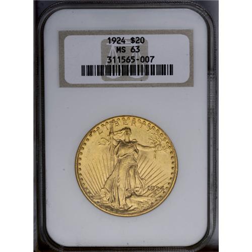 <B>1924<$20> MS63 NGC.</B></I> Struck in bright yellow-gold with above average eye appeal for the grade. A good vehicle to invest in gold. <BR><BR><B>Important notice:</B> Heritage usually auctions material at the rate of 200-250 lots per hour. On some occasions eBay Live bid software or the Internet may not be able to keep up with the pace of the auction. We recommend placing a realistic absentee bid now as insurance to avoid disappointment. Occasionally the auctioneer may eliminate or reject an eBay Live bid, and the auctioneer may also reopen a lot after the close of the eBay live bidding (usually because we missed an audience bid), and may reject your bid even if it shows you as the winning bidder. By bidding via eBay Live, you agree that Heritage may award the lot to another bidder at its sole discretion under the circumstances described above or any other reasonable circumstances. Since eBay bids are not shown to us until we open the lot on the floor, we treat those bids just like floor bids. In most cases the floor responds before the eBay bid is presented to us, due to Internet lag time, so for consistency we have made it a policy that floor bids are always considered first over tie eBay live bids. Also please note that all Heritage lots purchased through eBay Live carry a 20% Buyer's Premium. Please make sure you read the Terms and Conditions before you bid. This lot is being auctioned in conjunction with a live floor auction by Heritage Galleries & Auctioneers. All final auction and invoice information will be supplied by Heritage Galleries & Auctioneers, and all other information should be considered preliminary. Lot:4694 <BR><BR><B>Winning Notification and Billing:</B> After the FINAL session in this auction is complete, Heritage will send e-mail and snail mail invoices. This process normally takes several days. All final auction and invoice information will be supplied by Heritage Galleries & Auctioneers, and all other information should be considered preliminary. <BR><BR>This auction will be conducted on a live auction floor and over the Internet through eBay Live. If you choose to place an absentee bid, please take a moment to <font color='#0000ff'><u><a href='http://pages.ebay.com/liveauctions/help/before/laabsentee.html'>learn how eBay Live absentee bidding works</a></u></font><font color='#000000'>
