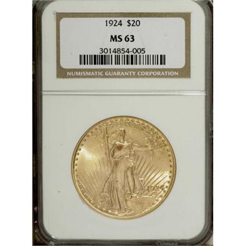 <B>1924 $20 MS63 NGC.</B></I> NGC Census: (78769/112196). PCGS Population (63363/90275). Mintage: 4,323,500. Numismedia Wsl. Price for NGC/PCGS coin in MS63: $795. (#9177)<BR><BR><B>Coin Engraver:</B> Augustus Saint-Gaudens<BR><BR><b>Shipping:</b> Coins & Currency (<a target="_blank" href="http://www.heritageauctions.com/common/shipping.php">view shipping information</a>)