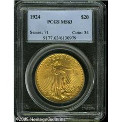 <B>1924 $20 MS63 PCGS.</B></I> A nicely struck lemon-gold piece with pleasing surfaces. Traces of debris near the date and sun confirm the originality. Lot:9658