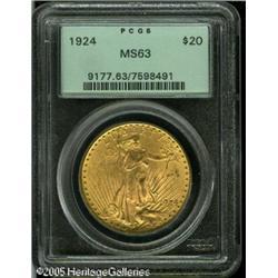 <B>1924 $20 MS63 PCGS.</B></I> The field show frosty luster and the highpoints have the dirty-gold look. Lot:9665