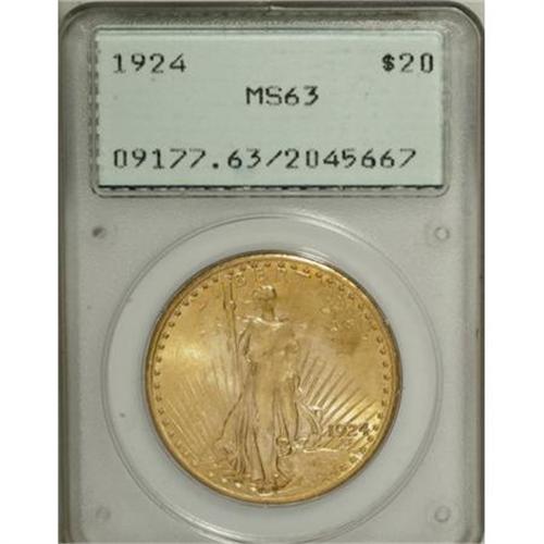 <B>1924 $20 MS63 PCGS.</B></I> An attractive canary-gold type coin that benefits from an exceptionally sharp strike. Faint obverse luster grazes are fewer in number than expected of the grade. Encapsulated in a prior generation holder.<BR><I>From the Reuben Reinstein Collection.</B></I><BR><BR><b>Shipping:</b> Coins & Currency (<a target="_blank" href="http://www.heritageauctions.com/common/shipping.php">view shipping information</a>)