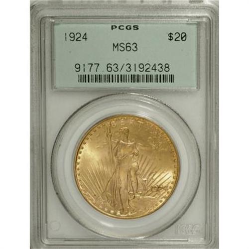 <B>1924 $20 MS63 PCGS.</B></I> PCGS Population (62742/85235). NGC Census: (78558/111552). Mintage: 4,323,500. Numismedia Wsl. Price for NGC/PCGS coin in MS63: $790. (#9177)<BR><BR><B>Coin Engraver:</B> Augustus Saint-Gaudens<BR><BR><b>Shipping:</b> Coins & Currency (<a target="_blank" href="http://www.heritageauctions.com/common/shipping.php">view shipping information</a>\)