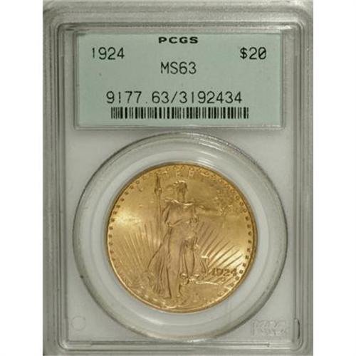 <B>1924 $20 MS63 PCGS.</B></I> PCGS Population (62742/85235). NGC Census: (78558/111552). Mintage: 4,323,500. Numismedia Wsl. Price for NGC/PCGS coin in MS63: $790. (#9177)<BR><BR><B>Coin Engraver:</B> Augustus Saint-Gaudens<BR><BR><b>Shipping:</b> Coins & Currency (<a target="_blank" href="http://www.heritageauctions.com/common/shipping.php">view shipping information</a>\)