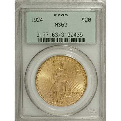 <B>1924 $20 MS63 PCGS.</B></I> PCGS Population (62742/85235). NGC Census: (78558/111552). Mintage: 4,323,500. Numismedia Wsl. Price for NGC/PCGS coin in MS63: $790. (#9177)<BR><BR><B>Coin Engraver:</B> Augustus Saint-Gaudens<BR><BR><b>Shipping:</b> Coins & Currency (<a target="_blank" href="http://www.heritageauctions.com/common/shipping.php">view shipping information</a>\)
