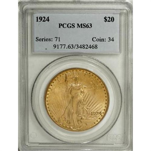 <B>1924 $20 MS63 PCGS.</B></I> PCGS Population (63363/90275). NGC Census: (78997/112655). Mintage: 4,323,500. Numismedia Wsl. Price for NGC/PCGS coin in MS63: $795. (#9177)<BR><BR><B>Coin Engraver:</B> Augustus Saint-Gaudens<BR><BR><b>Shipping:</b> Coins & Currency (<a target="_blank" href="http://www.heritageauctions.com/common/shipping.php">view shipping information</a>)