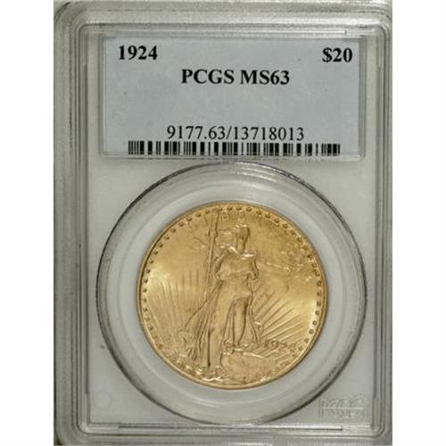 <B>1924 $20 MS63 PCGS.</B></I> PCGS Population (63601/91191). NGC Census: (78997/112655). Mintage: 4,323,500. Numismedia Wsl. Price for NGC/PCGS coin in MS63: $785. (#9177)<BR><BR><B>Coin Engraver:</B> Augustus Saint-Gaudens<BR><BR><b>Shipping:</b> Coins & Currency (<a target="_blank" href="http://www.heritageauctions.com/common/shipping.php">view shipping information</a>)