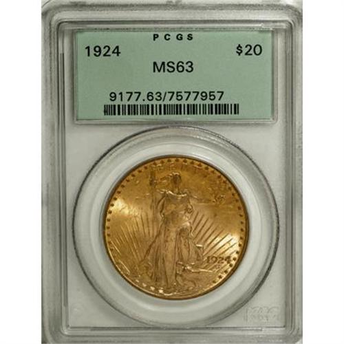 <B>1924 $20 MS63 PCGS.</B></I> PCGS Population (64244/94835). NGC Census: (80154/114101). Mintage: 4,323,500. Numismedia Wsl. Price for NGC/PCGS coin in MS63: $935. (#9177)<BR><BR><B>Coin Engraver:</B> Augustus Saint-Gaudens<BR><BR><b>Shipping:</b> Coins & Currency (<a target="_blank" href="http://www.heritageauctions.com/common/shipping.php">view shipping information</a>)