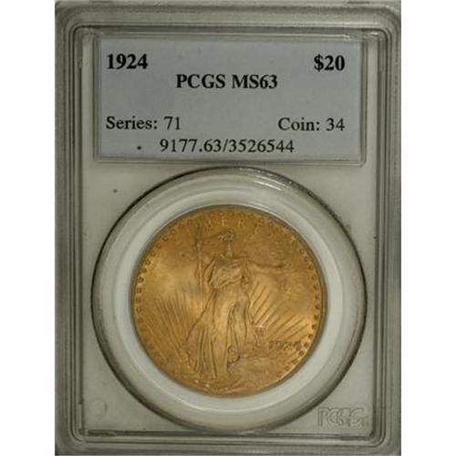 <B>1924 $20 MS63 PCGS.</B></I> PCGS Population (65123/98564). NGC Census: (81482/115542). Mintage: 4,323,500. Numismedia Wsl. Price for NGC/PCGS coin in MS63: $1,100. (#9177)<BR><BR><B>Coin Engraver:</B> Augustus Saint-Gaudens<BR><BR><b>Shipping:</b> Coins & Currency (<a target="_blank" href="http://www.heritageauctions.com/common/shipping.php">view shipping information</a>)