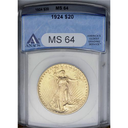 <B>1924<$20> MS64 ANACS.</B></I> A Choice Mint State example with excellent eye appeal. The design elements are boldly rendered. Only a few minor surface marks keep this out of the Gem grade range.