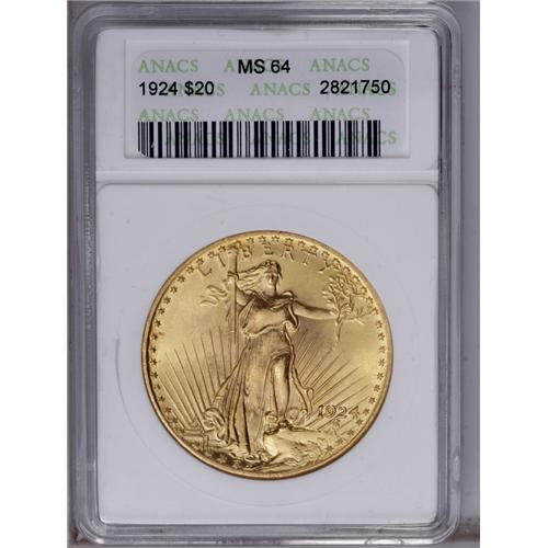 <B>1924<$20> MS64 ANACS.</B></I> Beautiful honey-gold color is seen on each side of this lovely Saint-Gaudens twenty. A sharp strike and rich satiny mint luster run throughout.