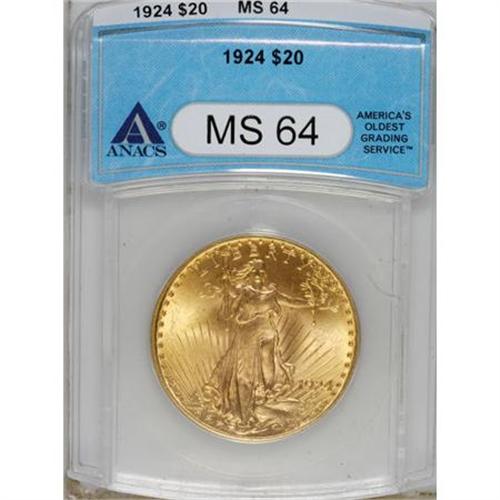 <B>1924 $20 MS64 ANACS.</B></I> NGC Census: (81956/29088). PCGS Population (53197/32038). Mintage: 4,323,500. Numismedia Wsl. Price for NGC/PCGS coin in MS64: $890. (#9177)<BR><BR><b>Shipping:</b> Coins & Currency (<a target="_blank" href="http://www.heritageauctions.com/common/shipping.php">view shipping information</a>)