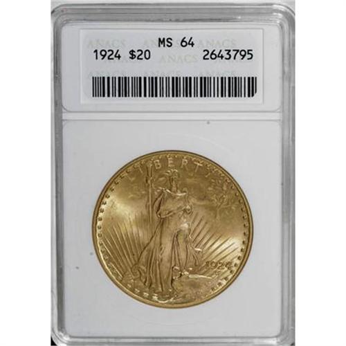 <B>1924 $20 MS64 ANACS.</B></I> NGC Census: (82311/29241). PCGS Population (53197/32038). Mintage: 4,323,500. Numismedia Wsl. Price for NGC/PCGS coin in MS64: $860. (#9177)<BR><BR><B>Coin Engraver:</B> Augustus Saint-Gaudens<BR><BR><b>Shipping:</b> Coins & Currency (<a target="_blank" href="http://www.heritageauctions.com/common/shipping.php">view shipping information</a>\)