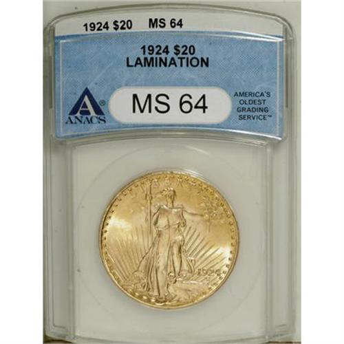 <B>1924 $20 --Lamination--ANACS. MS64.</B></I> ANACS Population (55604/34671). NGC Census: (82718/29478). Mintage: 4,323,500. Numismedia Wsl. Price for NGC/PCGS coin in MS64: $840. (#9177)<BR><BR><B>Coin Engraver:</B> Augustus Saint-Gaudens<BR><BR><b>Shipping:</b> Coins & Currency (<a target="_blank" href="http://www.heritageauctions.com/common/shipping.php">view shipping information</a>)