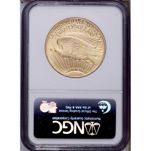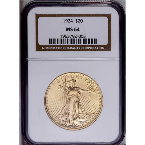 <B>1924<$20> MS64 NGC.</B></I> A satiny and radiant near-Gem with an uncommonly clean obverse for the assigned grade. The Capitol building and the top of the torch are incompletely brought up, but the piece is nonetheless attractive.