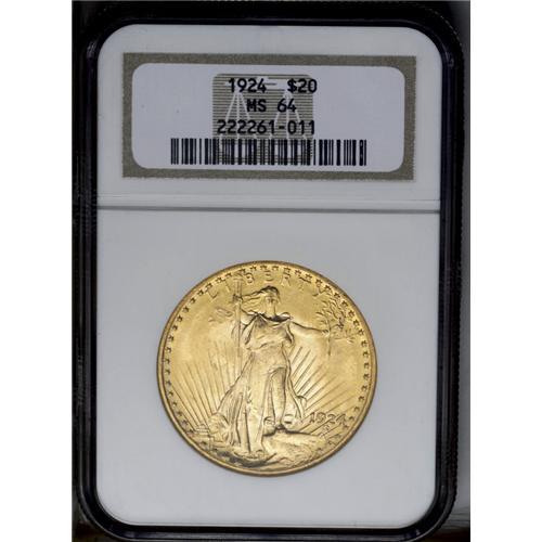 1924 $20 MS64 NGC. A solidly struck and highly lustrou