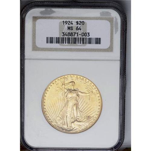 <B>1924<$20> MS64 NGC.</B></I> Brilliant light yellow-gold surfaces with frosty luster.
