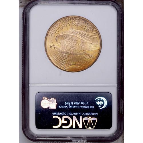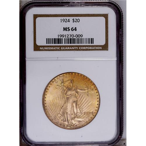 <B>1924<$20> MS64 NGC.</B></I> Golden-orange surfaces exhibit soft, frosted luster and modest contact marks primarily on the central devices. Areas of deep, multicolored iridescence are seen on the top right obverse, and the lower portion of the reverse. <BR><BR><B>Important notice:</B> Heritage usually auctions material at the rate of 200-250 lots per hour. On some occasions eBay Live bid software or the Internet may not be able to keep up with the pace of the auction. We recommend placing a realistic absentee bid now as insurance to avoid disappointment. Occasionally the auctioneer may eliminate or reject an eBay Live bid, and the auctioneer may also reopen a lot after the close of the eBay live bidding (usually because we missed an audience bid), and may reject your bid even if it shows you as the winning bidder. By bidding via eBay Live, you agree that Heritage may award the lot to another bidder at its sole discretion under the circumstances described above or any other reasonable circumstances. Since eBay bids are not shown to us until we open the lot on the floor, we treat those bids just like floor bids. In most cases the floor responds before the eBay bid is presented to us, due to Internet lag time, so for consistency we have made it a policy that floor bids are always considered first over tie eBay live bids. Also please note that all Heritage lots purchased through eBay Live carry a 20% Buyer's Premium. Please make sure you read the Terms and Conditions before you bid. This lot is being auctioned in conjunction with a live floor auction by Heritage Galleries & Auctioneers. All final auction and invoice information will be supplied by Heritage Galleries & Auctioneers, and all other information should be considered preliminary. Lot:4695 <BR><BR><B>Winning Notification and Billing:</B> After the FINAL session in this auction is complete, Heritage will send e-mail and snail mail invoices. This process normally takes several days. All final auction and invoice information will be supplied by Heritage Galleries & Auctioneers, and all other information should be considered preliminary. <BR><BR>This auction will be conducted on a live auction floor and over the Internet through eBay Live. If you choose to place an absentee bid, please take a moment to <font color='#0000ff'><u><a href='http://pages.ebay.com/liveauctions/help/before/laabsentee.html'>learn how eBay Live absentee bidding works</a></u></font><font color='#000000'>