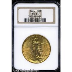 <B>1924 $20 MS64 NGC.</B></I> Lustrous with frosty yellow-gold surfaces. This is an attractive example for the date or type collector. Lot:9682