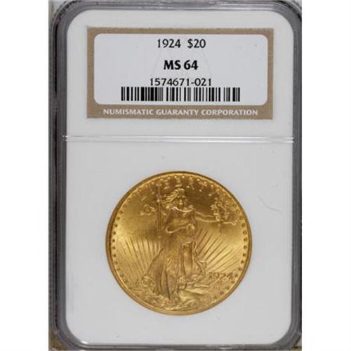 <B>1924 $20 MS64 NGC.</B></I> NGC Census: (81956/29088). PCGS Population (53197/32038). Mintage: 4,323,500. Numismedia Wsl. Price for NGC/PCGS coin in MS64: $890. (#9177)<BR><BR><b>Shipping:</b> Coins & Currency (<a target="_blank" href="http://www.heritageauctions.com/common/shipping.php">view shipping information</a>)