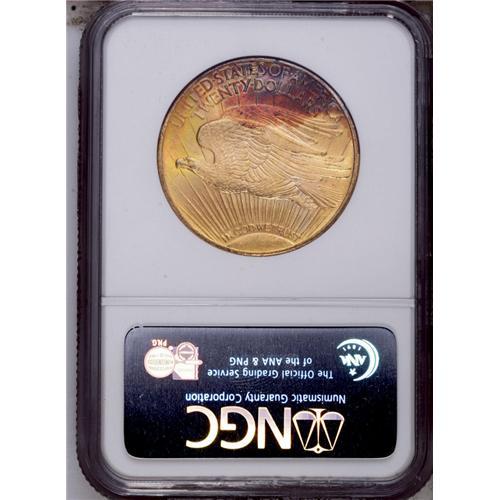 <B>1924<$20> MS64 NGC.</B></I> Unusually toned across the lower obverse and upper reverse with swaths of ruby-red, lime, and ocean-blue patina. The eagle's wings are moderately abraded.
