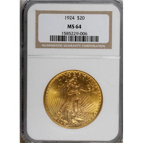 <B>1924 $20 MS64 NGC.</B></I> NGC Census: (82718/29478). PCGS Population (55160/34568). Mintage: 4,323,500. Numismedia Wsl. Price for NGC/PCGS coin in MS64: $840. (#9177)<BR><BR><B>Coin Engraver:</B> Augustus Saint-Gaudens<BR><BR><b>Shipping:</b> Coins & Currency (<a target="_blank" href="http://www.heritageauctions.com/common/shipping.php">view shipping information</a>)