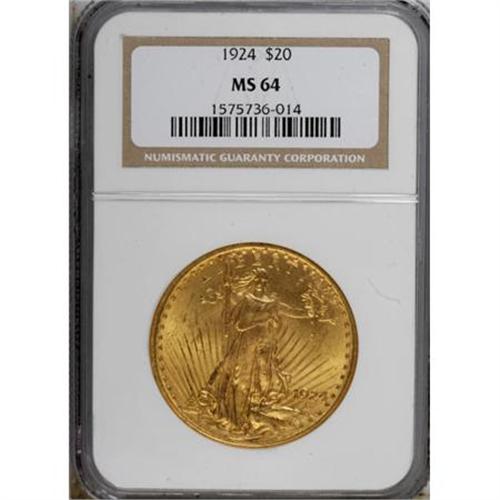 <B>1924 $20 MS64 NGC.</B></I> NGC Census: (82718/29478). PCGS Population (55387/34617). Mintage: 4,323,500. Numismedia Wsl. Price for NGC/PCGS coin in MS64: $840. (#9177)<BR><BR><B>Coin Engraver:</B> Augustus Saint-Gaudens<BR><BR><b>Shipping:</b> Coins & Currency (<a target="_blank" href="http://www.heritageauctions.com/common/shipping.php">view shipping information</a>)