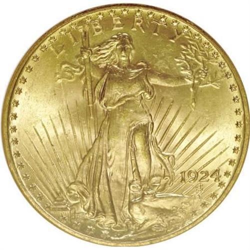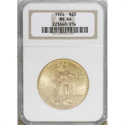 <B>1924 $20 MS64 NGC.</B></I> NGC Census: (83823/29987). PCGS Population (57742/36636). Mintage: 4,323,500. Numismedia Wsl. Price for NGC/PCGS coin in MS64: $1,035. (#9177)<BR><BR><B>Coin Engraver:</B> Augustus Saint-Gaudens<BR><BR><b>Shipping:</b> Coins & Currency (<a target="_blank" href="http://www.heritageauctions.com/common/shipping.php">view shipping information</a>)