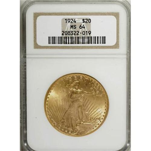 <B>1924 $20 MS64 NGC.</B></I> NGC Census: (83823/29987). PCGS Population (57742/36636). Mintage: 4,323,500. Numismedia Wsl. Price for NGC/PCGS coin in MS64: $1,035. (#9177)<BR><BR><B>Coin Engraver:</B> Augustus Saint-Gaudens<BR><BR><b>Shipping:</b> Coins & Currency (<a target="_blank" href="http://www.heritageauctions.com/common/shipping.php">view shipping information</a>)