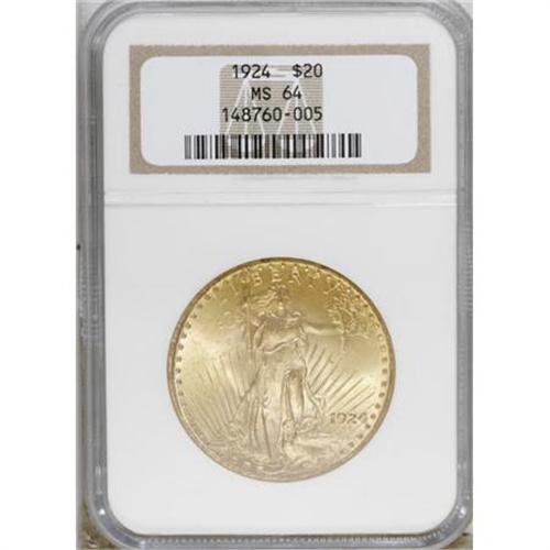 <B>1924 $20 MS64 NGC.</B></I> NGC Census: (83823/29987). PCGS Population (57742/36636). Mintage: 4,323,500. Numismedia Wsl. Price for NGC/PCGS coin in MS64: $1,035. (#9177)<BR><BR><B>Coin Engraver:</B> Augustus Saint-Gaudens<BR><BR><b>Shipping:</b> Coins & Currency (<a target="_blank" href="http://www.heritageauctions.com/common/shipping.php">view shipping information</a>)