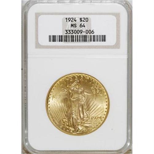 <B>1924 $20 MS64 NGC.</B></I> . NGC Census: (84475/30339). PCGS Population (58620/37494). Mintage: 4,323,500. Numismedia Wsl. Price for NGC/PCGS coin in MS64: $1,170. (#9177)<BR><BR><B>Coin Engraver:</B> Augustus Saint-Gaudens<BR><BR><b>Shipping:</b> Coins & Currency (<a target="_blank" href="http://www.heritageauctions.com/common/shipping.php">view shipping information</a>)
