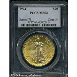 1924 $20 MS64 PCGS. A beautiful lemon-gold near-Ge <B>1924 $20 MS64 PCGS.</B></I> A beautiful lemon-gold near-Gem with sweeping cartwheel luster and an imposing strike. Lightly marked surfaces contribute further to the eye appeal. <BR><BR><B>Important notice:</B> Heritage usually auctions material at the rate of 200-250 lots per hour. On some occasions eBay Live bid software or the Internet may not be able to keep up with the pace of the auction. We recommend placing a realistic absentee bid now as insurance to avoid disappointment. Occasionally the auctioneer may eliminate or reject an eBay Live bid, and the auctioneer may also reopen a lot after the close of the eBay live bidding (usually because we missed an audience bid), and may reject your bid even if it shows you as the winning bidder. By bidding via eBay Live, you agree that Heritage may award the lot to another bidder at its sole discretion under the circumstances described above or any other reasonable circumstances. Since eBay bids are not shown to us until we open the lot on the floor, we treat those bids just like floor bids. In most cases the floor responds before the eBay bid is presented to us, due to Internet lag time, so for consistency we have made it a policy that floor bids are always considered first over tie eBay live bids. Also please note that all Heritage lots purchased through eBay Live carry a 20% Buyer's Premium. Please make sure you read the Terms and Conditions before you bid. This lot is being auctioned in conjunction with a live floor auction by Heritage Galleries & Auctioneers. All final auction and invoice information will be supplied by Heritage Galleries & Auctioneers, and all other information should be considered preliminary. Lot:7204