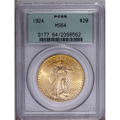 <B>1924 $20 MS64 PCGS.</B></I> A dazzling lemon-gold near-Gem, intricately struck and with an especially undisturbed reverse. Housed in an old green label holder.