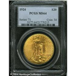 1924 $20 MS64 PCGS. Bright wisps of lemon-gold pat <B>1924 $20 MS64 PCGS.</B></I> Bright wisps of lemon-gold patina adorn this lustrous and carefully preserved Saint-Gaudens. <BR><BR><B>Important notice:</B> Heritage usually auctions material at the rate of 200-250 lots per hour. On some occasions eBay Live bid software or the Internet may not be able to keep up with the pace of the auction. We recommend placing a realistic absentee bid now as insurance to avoid disappointment. Occasionally the auctioneer may eliminate or reject an eBay Live bid, and the auctioneer may also reopen a lot after the close of the eBay live bidding (usually because we missed an audience bid), and may reject your bid even if it shows you as the winning bidder. By bidding via eBay Live, you agree that Heritage may award the lot to another bidder at its sole discretion under the circumstances described above or any other reasonable circumstances. Since eBay bids are not shown to us until we open the lot on the floor, we treat those bids just like floor bids. In most cases the floor responds before the eBay bid is presented to us, due to Internet lag time, so for consistency we have made it a policy that floor bids are always considered first over tie eBay live bids. Also please note that all Heritage lots purchased through eBay Live carry a 20% Buyer's Premium. Please make sure you read the Terms and Conditions before you bid. This lot is being auctioned in conjunction with a live floor auction by Heritage Galleries & Auctioneers. All final auction and invoice information will be supplied by Heritage Galleries & Auctioneers, and all other information should be considered preliminary. Lot:7205