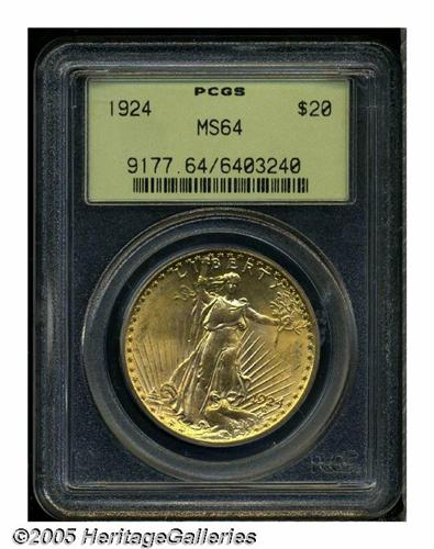 <B>1924<$20> MS64 PCGS.</B></I> Good color and luster, with only a few small surface blemishes on each side. A visually fetching near-Gem.