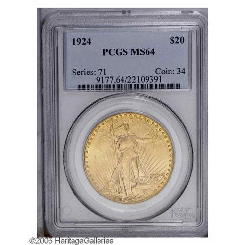 1924 $20 MS64 PCGS. Sharply struck and fully lustrous, 1924[$20] MS64 PCGS.