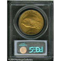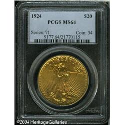 1924 $20 MS64 PCGS. Shimmering luster and deep red <B>1924 $20 MS64 PCGS.</B></I> Shimmering luster and deep red-gold color are the hallmarks of this unusual near-Gem. There are a few grade-limiting marks and abrasions, but overall the piece seems quite attractive and properly graded. <BR><BR><B>Important notice:</B> Heritage usually auctions material at the rate of 200-250 lots per hour. On some occasions eBay Live bid software or the Internet may not be able to keep up with the pace of the auction. We recommend placing a realistic absentee bid now as insurance to avoid disappointment. Occasionally the auctioneer may eliminate or reject an eBay Live bid, and the auctioneer may also reopen a lot after the close of the eBay live bidding (usually because we missed an audience bid), and may reject your bid even if it shows you as the winning bidder. By bidding via eBay Live, you agree that Heritage may award the lot to another bidder at its sole discretion under the circumstances described above or any other reasonable circumstances. Since eBay bids are not shown to us until we open the lot on the floor, we treat those bids just like floor bids. In most cases the floor responds before the eBay bid is presented to us, due to Internet lag time, so for consistency we have made it a policy that floor bids are always considered first over tie eBay live bids. Also please note that all Heritage lots purchased through eBay Live carry a 20% Buyer's Premium. Please make sure you read the Terms and Conditions before you bid. This lot is being auctioned in conjunction with a live floor auction by Heritage Galleries & Auctioneers. All final auction and invoice information will be supplied by Heritage Galleries & Auctioneers, and all other information should be considered preliminary. Lot:7213